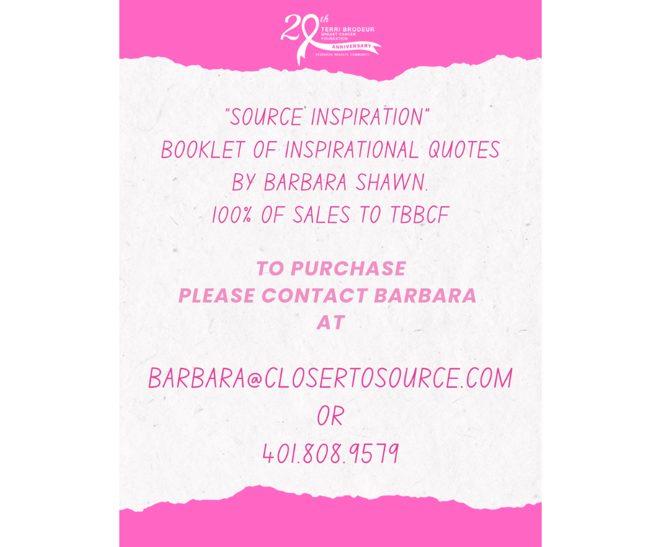 When you purchase her inspiring booklet, “Source Inspiration,” 100% of the proceeds will be donated to the Terri Brodeur Breast Cancer Foundation funding research to help find a cure.