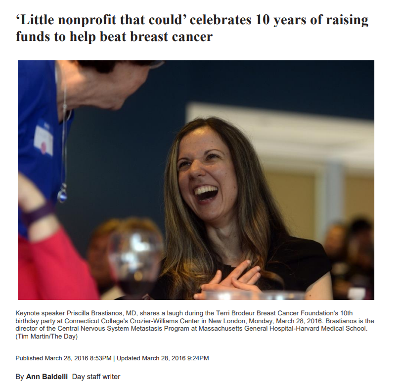 The March/April Newsletter covered TBBCF’s 10th birthday party featuring Keynote Speaker, Priscilla Brastianos, MD, 2012 TBBCF grant recipient. We were thrilled to get front page coverage in The Day in a front page article written by Ann Baldelli. TBBCF Facebook followers can view the 10th birthday party photos here. On April 4, 2016, Eric Parker, WFSB Channel 3, presented a special medical report on Dr. Brastianos’ research at Mass General Hospital in Boston. Click here to watch the special medical report.
