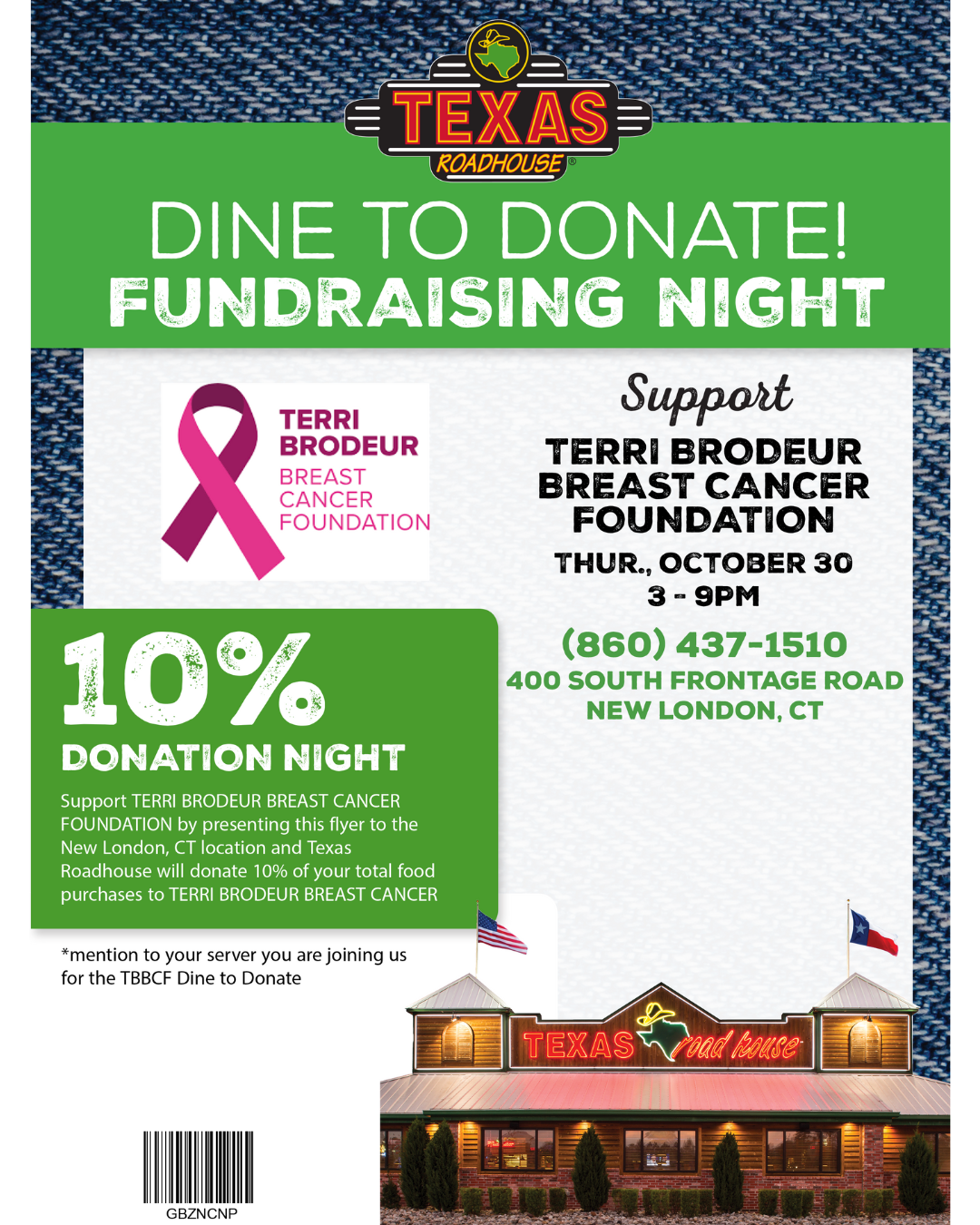 Support TBBCF by presenting the below flyer OR mentioning to your server you are dining for the TBBCF Dine to Donate and Texas Roadhouse will donate 10% of your total food purchases to TBBCF!